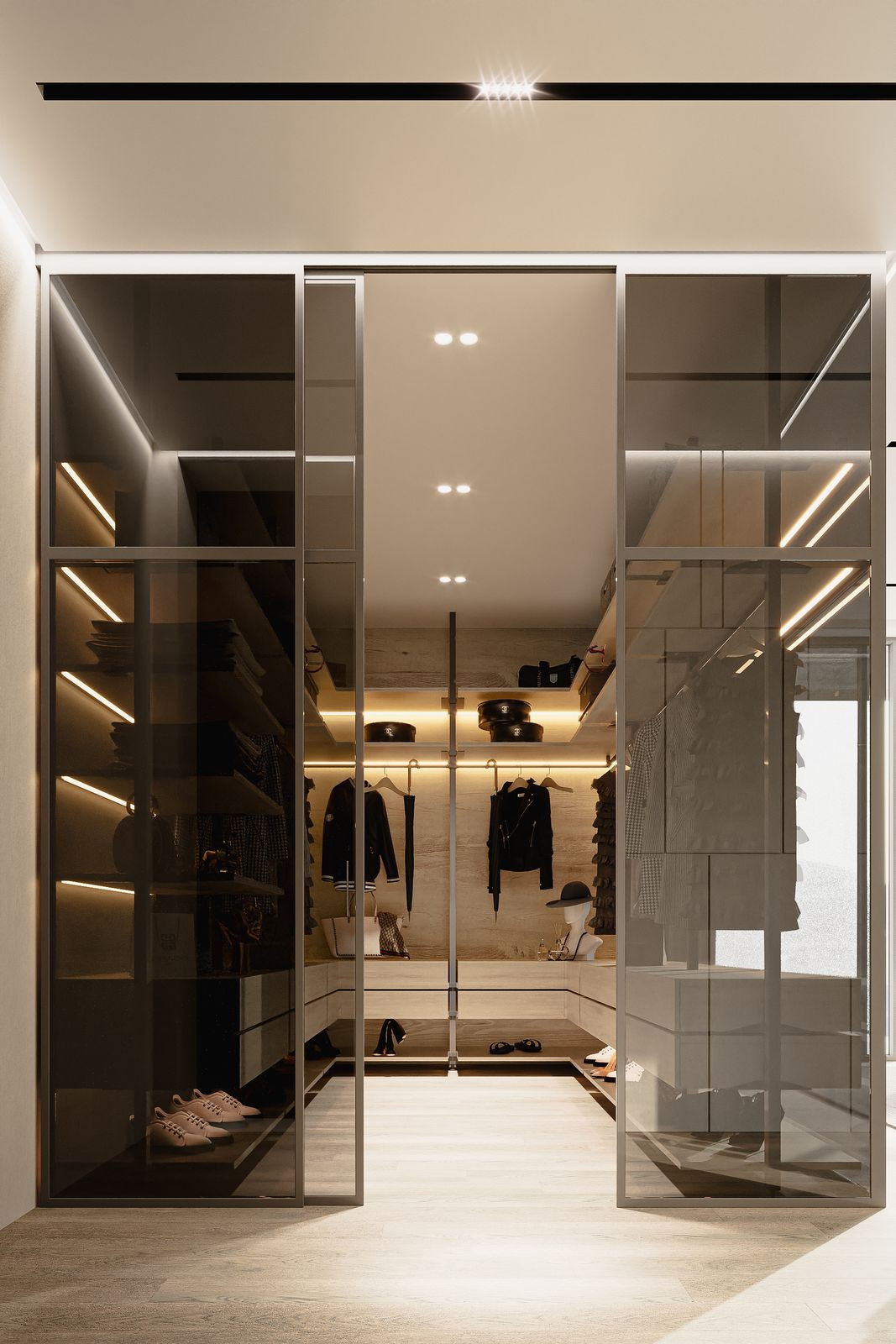 High-end features include a lift connecting all levels, gym, sauna, central air conditioning, and underfloor heating throughout for year-round comfort. The property also includes parking for several cars and a storage room.