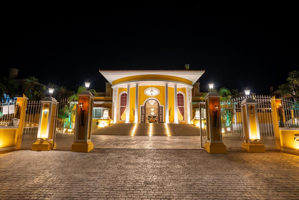 Located in Zone G of Sotogrande Alto, this large luxury villa was built by the current owner over a period of 10 years to a very high standard, using state-of-the-art materials and a wide selection of incredible crystal chandeliers. The large entrance hall features two curved marble staircases leading to the upper floor, where there are three bedrooms, one of which is the master suite, with Egyptian-themed décor, hand-painted walls, ornate moldings, and solid stone pillars. There is also a private living area overlooking the garden and pool. There is a dressing room and the main en-suite bathroom with a whirlpool tub and double walk-in shower. Two other spacious bedrooms, both en-suite, are located on this floor, connecting to the private terrace and from there, up the stairs to the private solarium. Inside the villa there is an elevator serving all 3 floors and on the ground floor there is the large living room, dining room, and doors to the covered terrace and pool area. There is also a service kitchen with pantry, utility room, and laundry/storage room. There is also a fully equipped cinema room with 8 leather seats. In the semi-basement is the entertainment suite, all decorated and hand-painted in an Egyptian theme, with matching decorations. There is a poker table, seating areas, a large cocktail bar, a modern gym with changing rooms and showers, and two further bedrooms with en-suite bathrooms, also in Egyptian style. In the center of the living room is a miniature theater modeled after London's West End theater, with two boxes and 37 seats. Luxuriously decorated in theatrical style, it comes with the complete set and props for a production of the musical Phantom of the Opera and offers a complete sound and lighting system, as well as the potential to show movies with the cinema system and stage for small private concerts. Work on the villa and grounds has not been completed, but this is a unique and personalized property, well worth viewing for the buyer looking for that special style home.