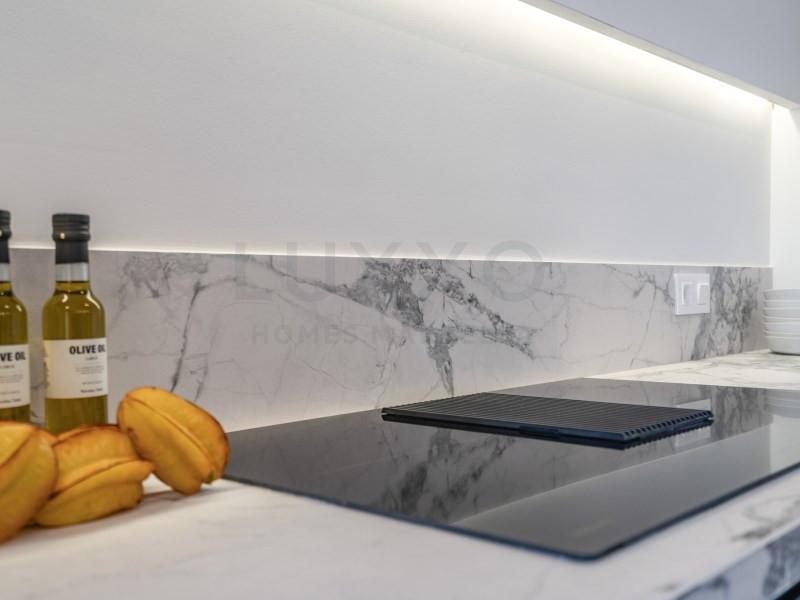 The property offers two comfortable bedrooms, each with its own beautifully finished bathroom. The entire apartment features a brand-new stylish floor and plenty of smart storage solutions, including custom-made wardrobes. There is also a separate storage and laundry area with extra cupboards and a neatly integrated built-in washing machine.