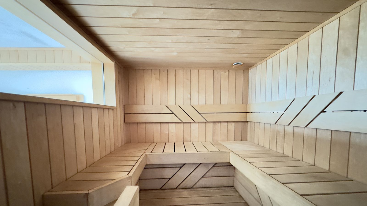 The lower level includes spacious living areas, two bedrooms, two bathrooms, a wine cellar and a sauna area with a dressing room and showers. The upper level features another fully equipped kitchen, an open living and dining area, two bedrooms, two bathrooms, a multipurpose room and a large glazed terrace with views towards the sea and mountains.