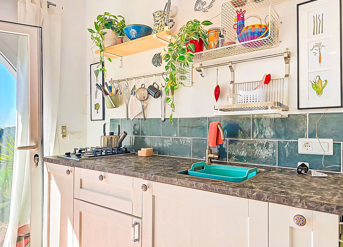 The separate guest apartment, accessed via steps from the pool terrace, offers privacy and flexibility for visiting family, friends, or rental opportunities. Its full-length terrace, bordered by mature citrus trees and Mediterranean planting, enjoys the same spectacular sea and village views. Inside, the apartment features an open-plan kitchen and dining area with a lounge subtly divided by a bookcase (3.5m x 6.5m). Glazed patio doors and a large floor-to-ceiling window fill the space with natural light. There is also a double bedroom (2.8m x 3.2m) with patio doors opening onto the terrace, and a shower room (1.9m x 1.5m).