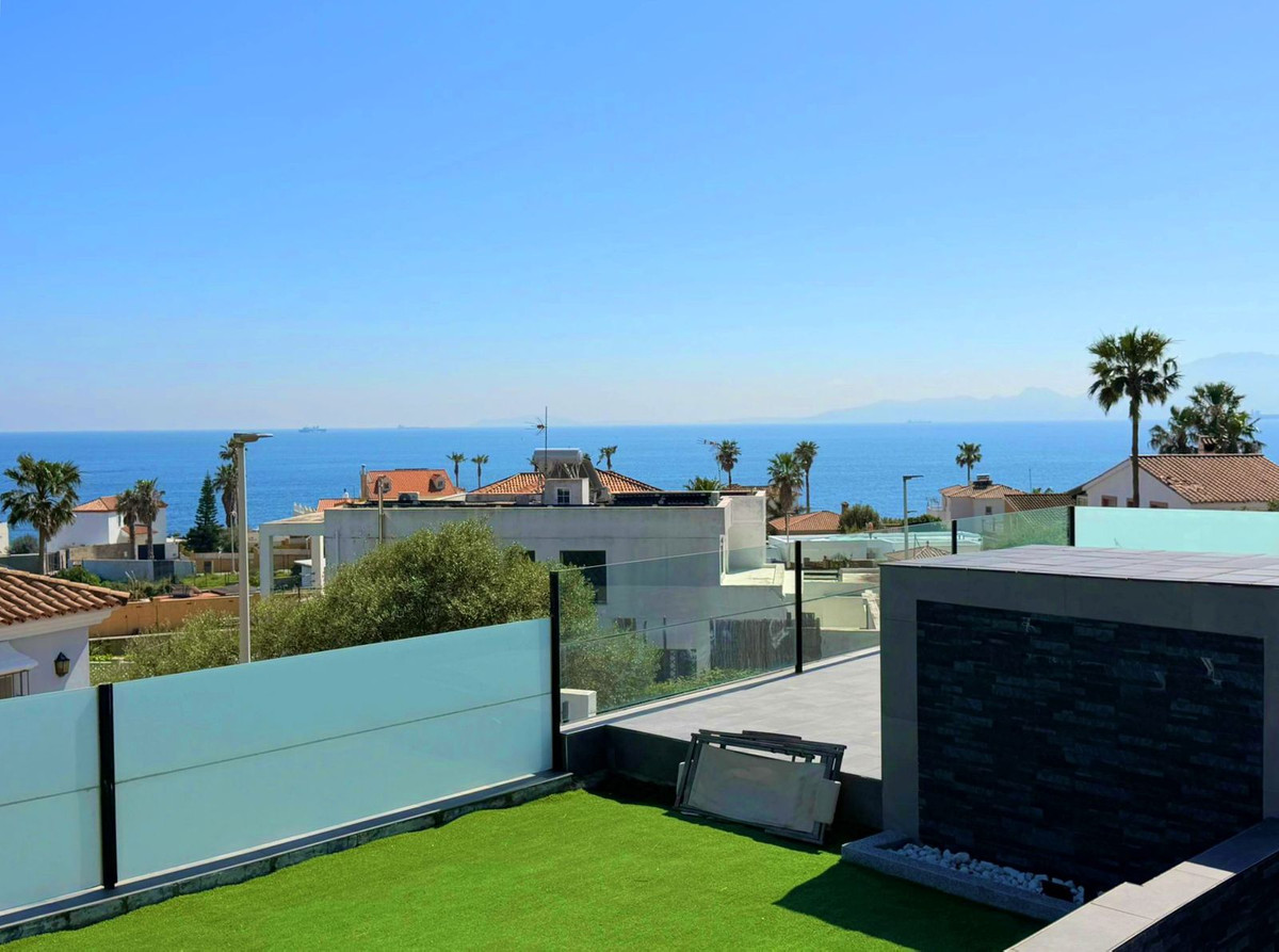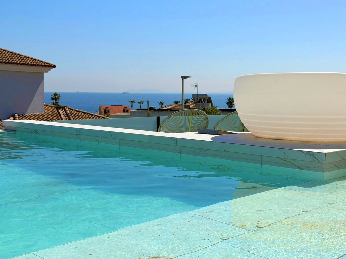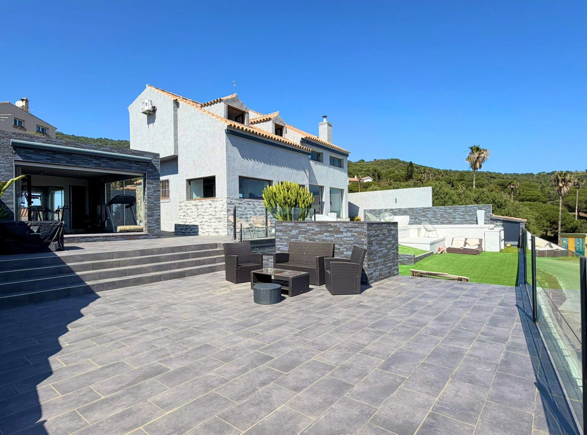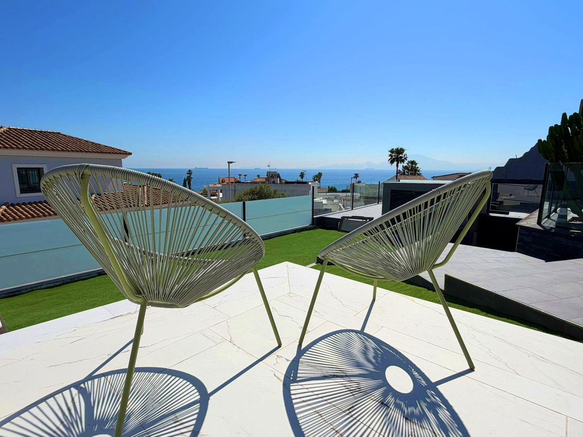 This spectacular, fully renovated villa is located in the მშვიდ and sought-after urbanisation of El Faro de Punta Carnero, surrounded by the Los Alcornocales Natural Park and just a few metres from the sea. It is the perfect place to enjoy nature without giving up the convenience of being close to the city. The property is distributed over two floors and stands out for its abundant natural light, with large windows that fill every space with brightness. The main floor features the living area: an entrance hall leading to a spacious living-dining room with access to a terrace offering stunning views, a fully equipped kitchen with an integrated dining area, a guest toilet, and a dressing room with access to a rear patio. The upper floor comprises two bedrooms and an en-suite bathroom with a hydromassage bathtub and shower, as well as an open space currently used as an office that could easily be converted into a third bedroom. Outside, the villa offers an infinity pool with an integrated jacuzzi, surrounded by a generous relaxation area, and a gym with a full bathroom and shower. The enclosed garage, with an automatic door, has a surface area of 45 sqm and space for two vehicles. Its location allows you to enjoy nature and outdoor activities such as hiking and cycling routes, water sports like paddle surfing or kayaking, and easy access to both the Costa del Sol and the Costa de la Luz, all just a few minutes from Algeciras.