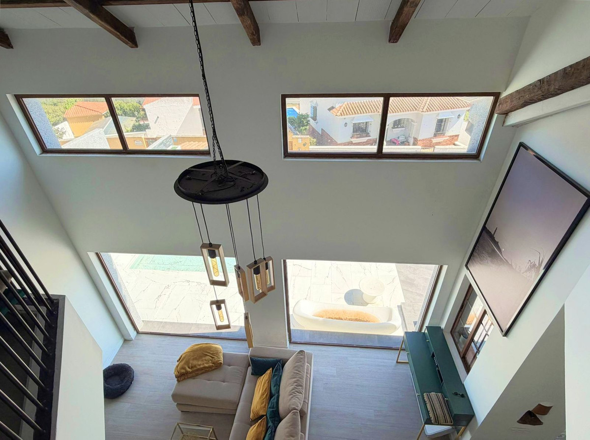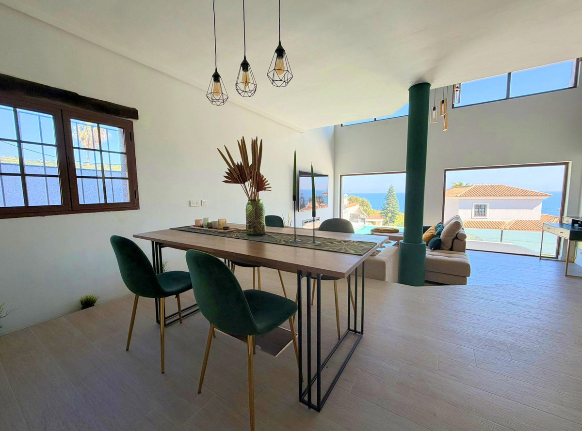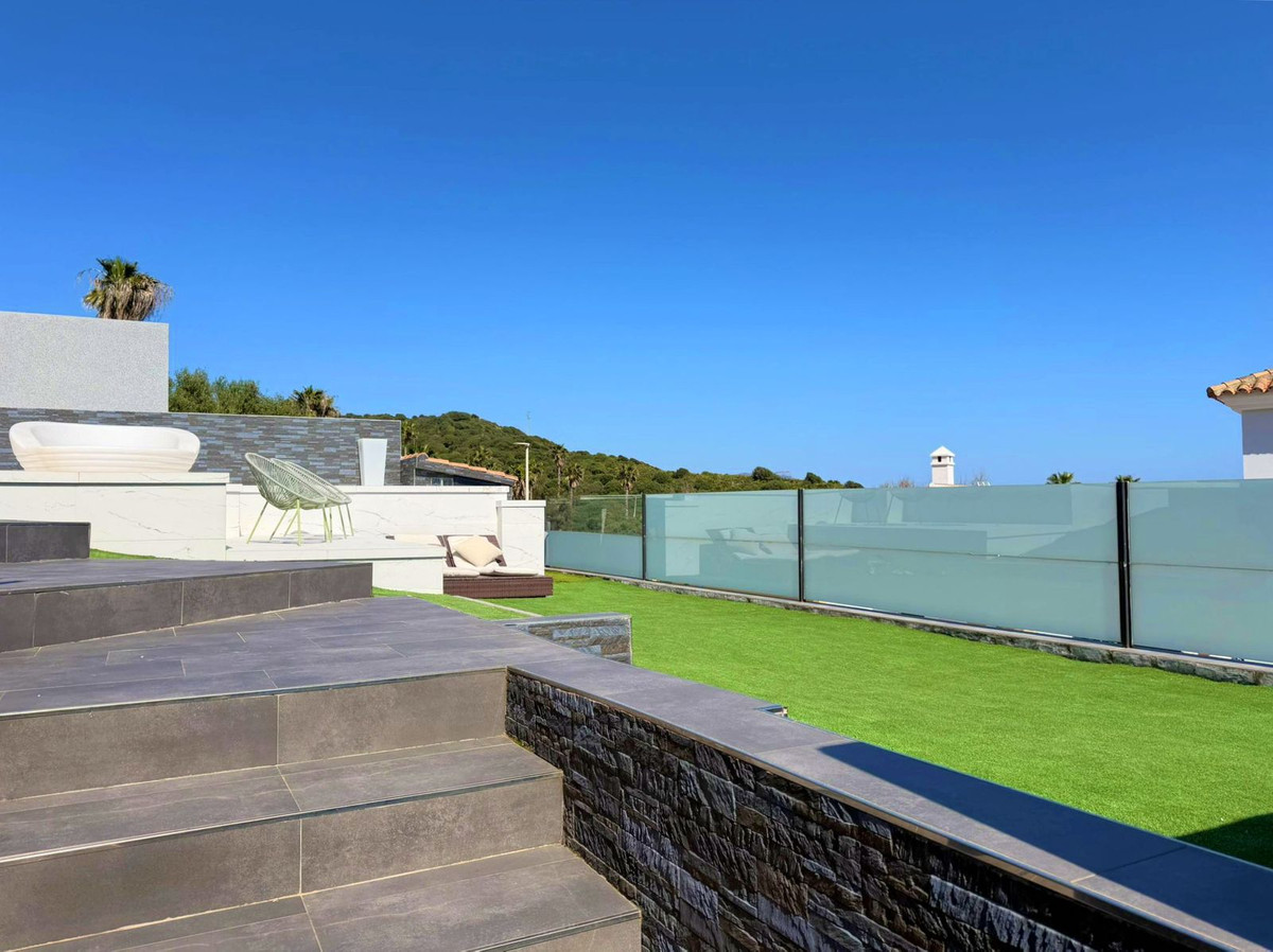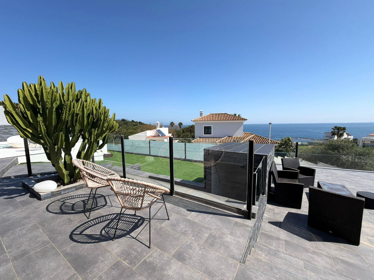 This spectacular, fully renovated villa is located in the მშვიდ and sought-after urbanisation of El Faro de Punta Carnero, surrounded by the Los Alcornocales Natural Park and just a few metres from the sea. It is the perfect place to enjoy nature without giving up the convenience of being close to the city. The property is distributed over two floors and stands out for its abundant natural light, with large windows that fill every space with brightness. The main floor features the living area: an entrance hall leading to a spacious living-dining room with access to a terrace offering stunning views, a fully equipped kitchen with an integrated dining area, a guest toilet, and a dressing room with access to a rear patio. The upper floor comprises two bedrooms and an en-suite bathroom with a hydromassage bathtub and shower, as well as an open space currently used as an office that could easily be converted into a third bedroom. Outside, the villa offers an infinity pool with an integrated jacuzzi, surrounded by a generous relaxation area, and a gym with a full bathroom and shower. The enclosed garage, with an automatic door, has a surface area of 45 sqm and space for two vehicles. Its location allows you to enjoy nature and outdoor activities such as hiking and cycling routes, water sports like paddle surfing or kayaking, and easy access to both the Costa del Sol and the Costa de la Luz, all just a few minutes from Algeciras.
