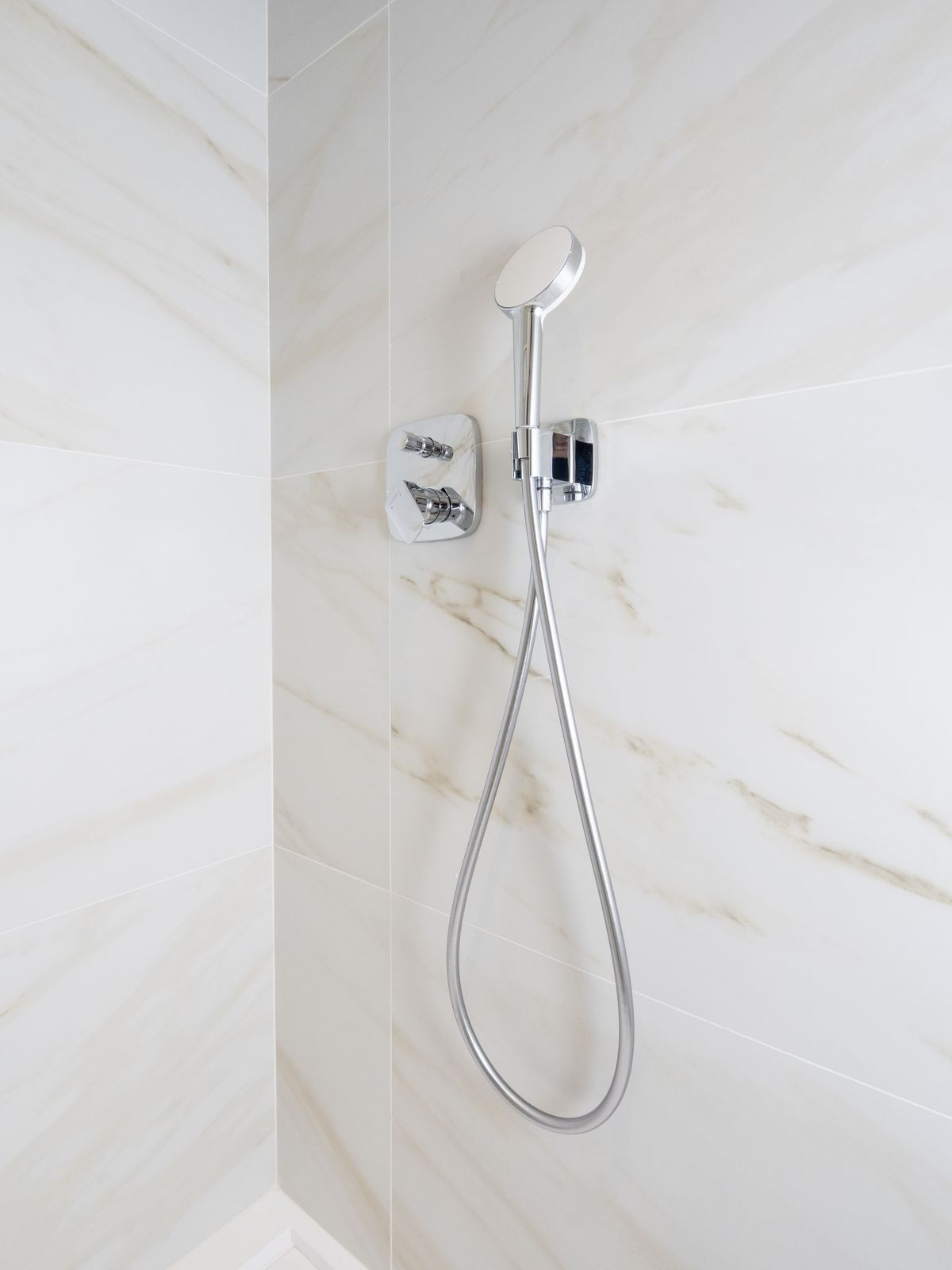 En-suite bathroom in the master bedroom, featuring a walk-in shower, washbasin, and toilet.
