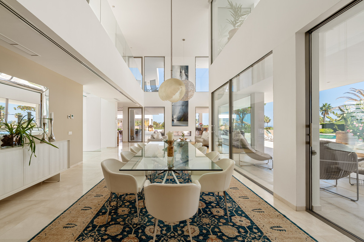 Stunning contemporary villa located in the prestigious neighbourhood of La Cerquilla, nestled in the heart of Nueva Andalucía’s Golf Valley. This exclusive seven bedroom residence offers exceptional privacy and breathtaking panoramic views of Marbella’s iconic La Concha mountain and the Mediterranean coastline. With its prime location near top golf courses, international schools, upscale restaurants, and the vibrant Puerto Banús marina, it represents a superb investment and lifestyle opportunity. Inside, the villa features expansive interiors thoughtfully designed with natural textures and refined finishes. Soaring ceilings, elegant lighting, and a harmonious indoor-outdoor flow define the main living areas. Custom furnishings, organic materials, and curated decor elements, such as woven wall art and hand-crafted ceramics add character and warmth throughout the home. The upper level presents a tranquil, gallery-style corridor overlooking the main floor, leading to serene bedrooms with sweeping views and private terraces. At the heart of the villa is a sleek, modern kitchen equipped with premium appliances and contemporary cabinetry, flowing into a spacious glass-enclosed dining area with floor-to-ceiling windows. Outdoor living is elevated with a striking pool and jacuzzi, Balinese-style sun loungers, and a covered dining terrace complete with a fireplace and barbecue ideal for entertaining year-round. A unique highlight is the private tennis court at the foot of the garden, offering a perfect recreational space for residents.