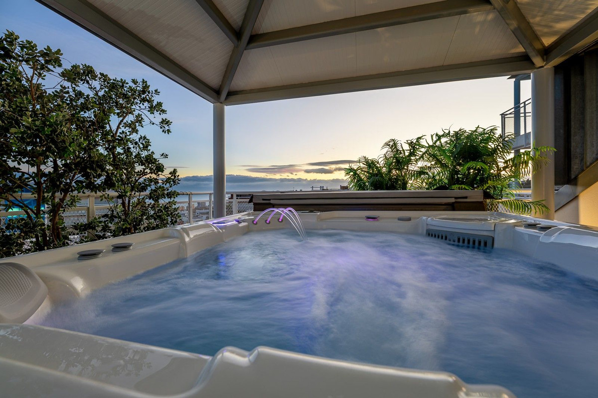 The expansive terrace is seemingly integrated with the indoor area, with an outdoor kitchen and bar, a covered glass dining area completed with a lavish spa/jacuzzi and shower under roof.