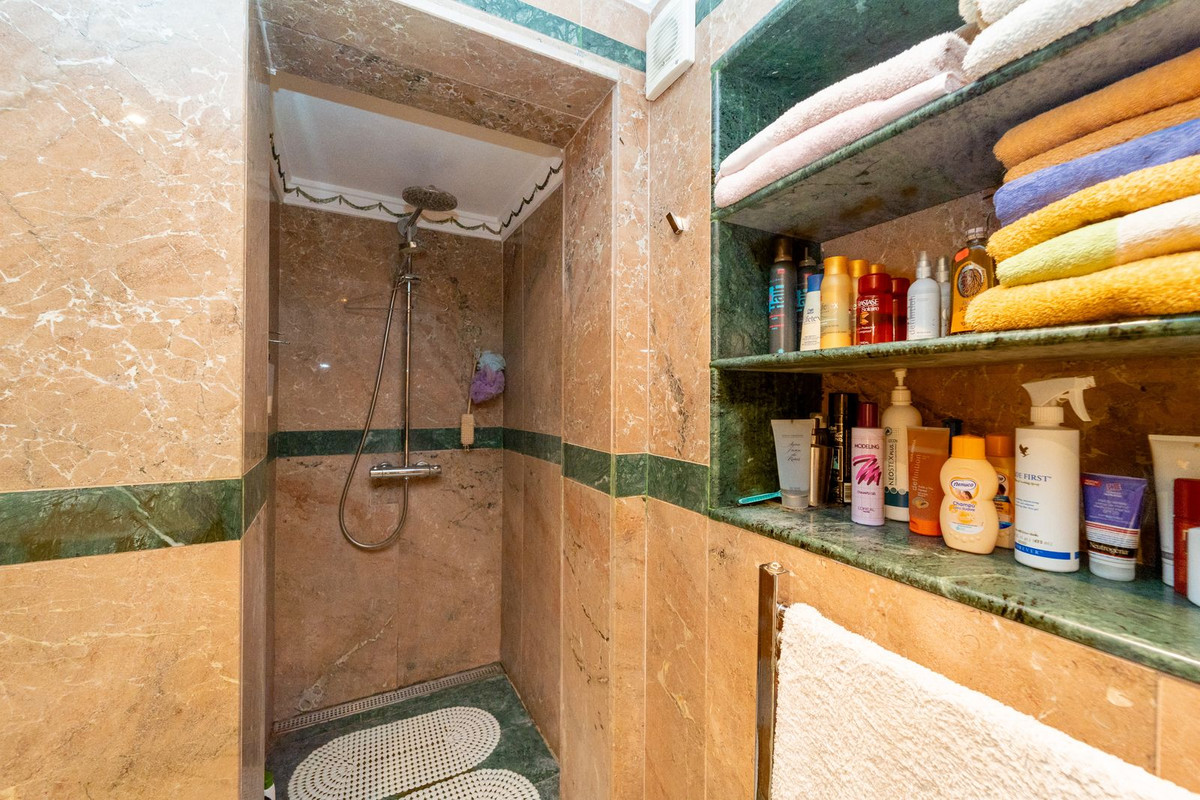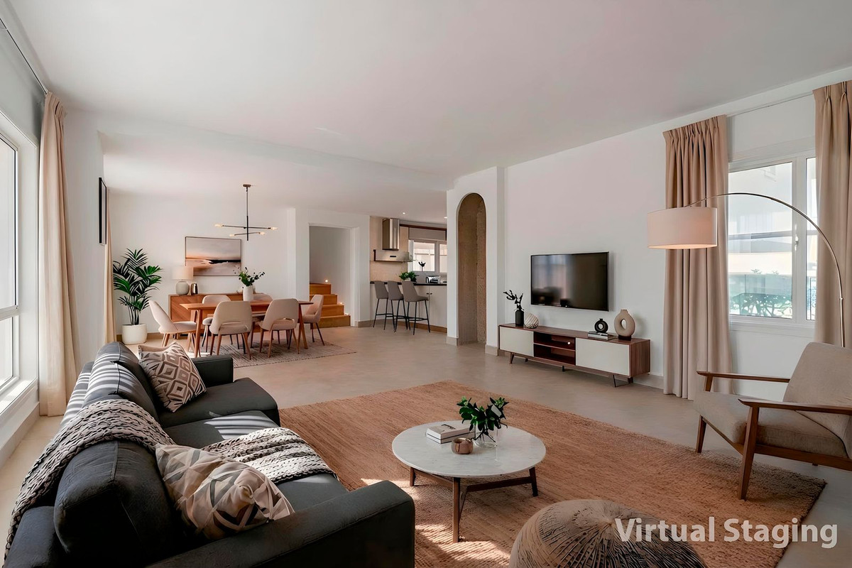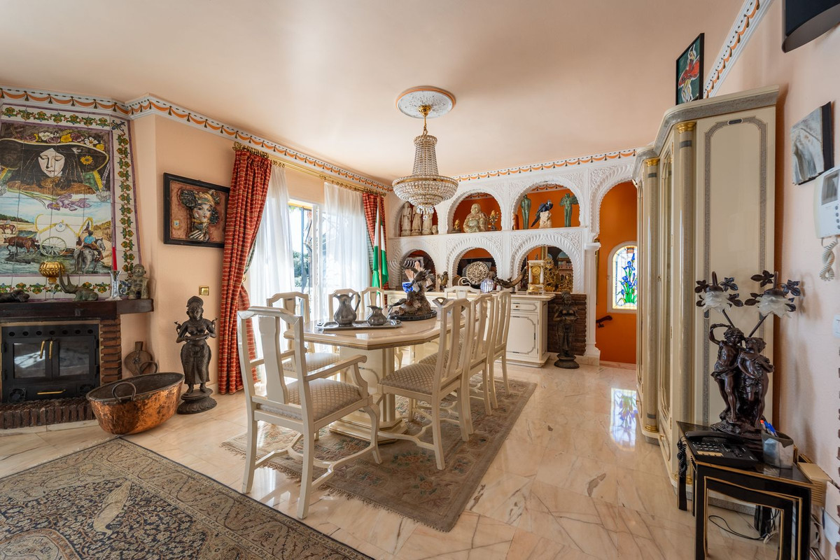 The entrance hall, reflecting classic Andalusian design, opens into the main living room — a bright and inviting space that connects directly to a large terrace. Here, you can imagine enjoying family breakfasts while admiring the spectacular sea views. Featuring marble floors, a fireplace, and air conditioning, this living area becomes the heart of the home and the perfect setting for unforgettable moments.