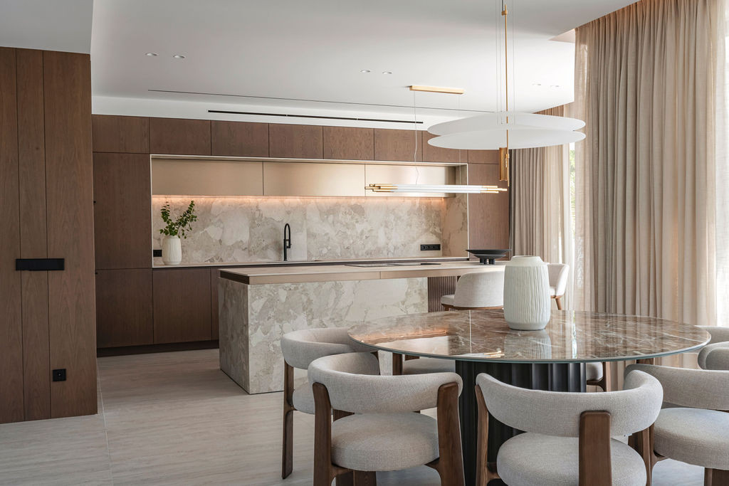 The upper floor is dedicated to the private living quarters, comprising four en-suite bedrooms. The master suite stands out with its private terrace and luxurious bathroom, creating a comfortable and private retreat. Several bedrooms enjoy access to terraces that enhance the indoor–outdoor lifestyle and provide pleasant open views.