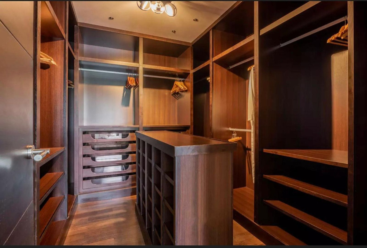 The villa spans three levels and features five elegant en-suite bedrooms, along with a small staff apartment on the lower ground floor, with its own kitchen and bathroom. The impressive master bedroom features a walk-in dressing room, an en-suite bathroom with bathtub and shower, and a private terrace with views of the golf course, swimming pool, and gardens.