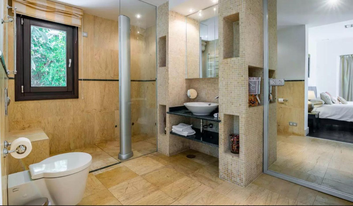 Built with high-quality materials, the property includes Tino marble, Iroko wood flooring, a fully equipped Miele kitchen, and designer staircases and entrance doors created by artist Sebastián Fisher. The villa is equipped with underfloor heating throughout, individual air conditioning, and a SONOS sound system.