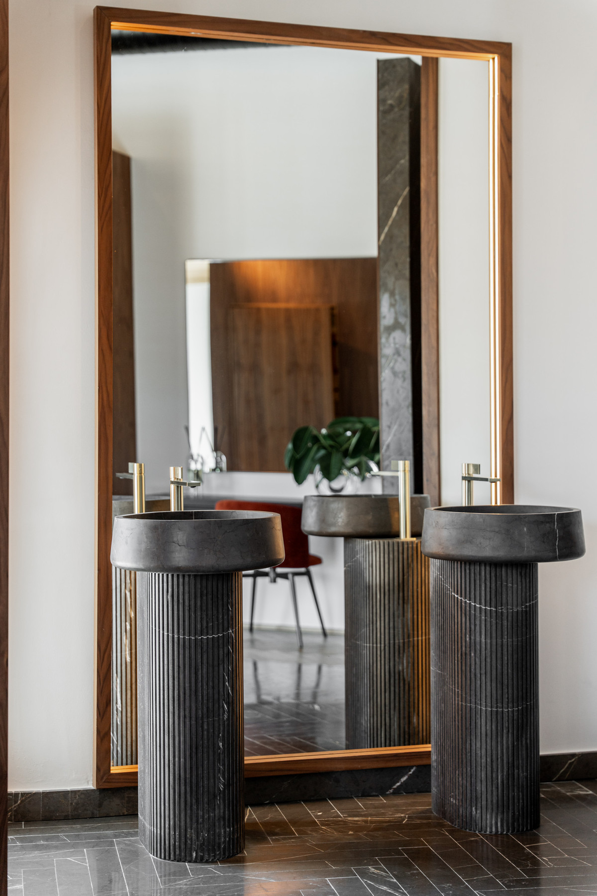Upstairs, the principal suite benefits from vaulted timber ceilings, open dressing, sculptural stone basins and a walk-in marble shower. Full-height glazing frames the views to the golf and sea, while maintaining privacy. The additional bedrooms follow the same standard of finish and proportion, each thoughtfully designed to maximise comfort. Practical elements, such as a separate utility room, integrated wine storage, custom carpentry and layered lighting, are integrated discreetly throughout.