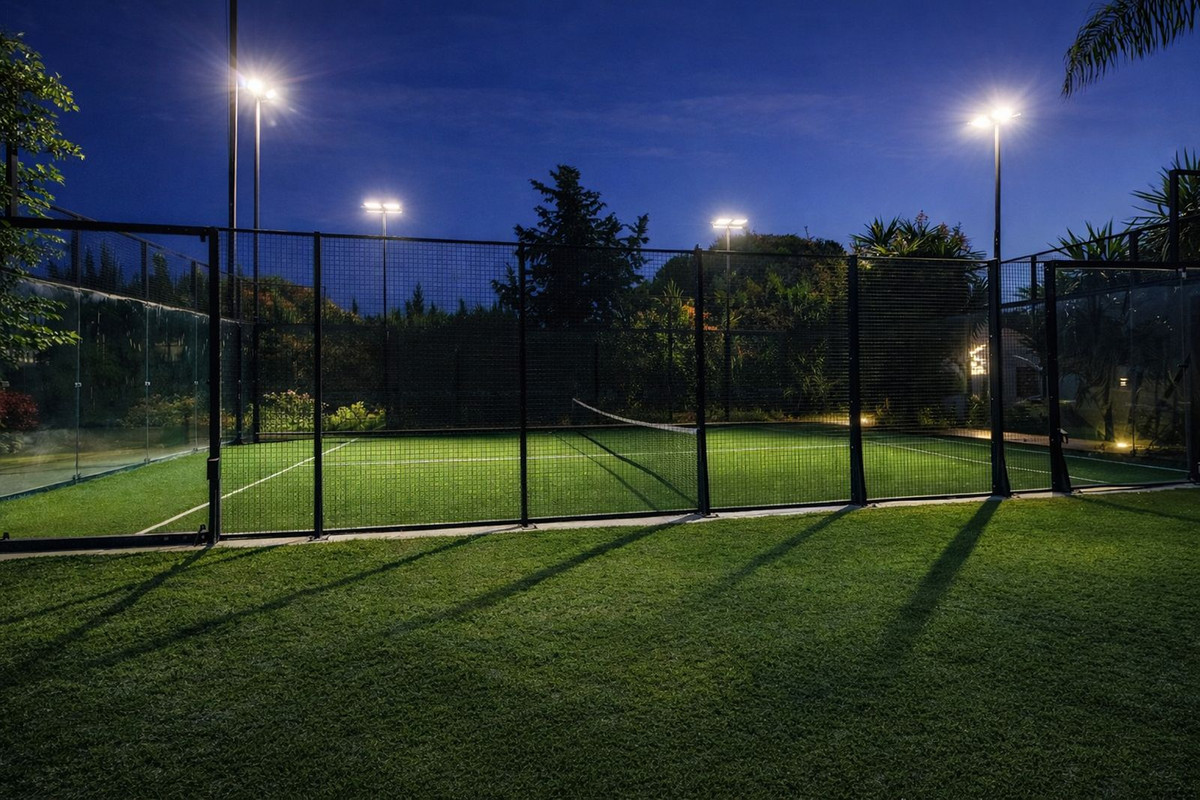 Outside, the estate really opens up. The grounds offer a rare combination of usable flat land, mature landscaping, and lifestyle amenities, including an infinity pool, new paddle tennis court, large barbecue and entertainment terrace, and fitted kitchen behind the BBQ and multiple areas for sun bathing, shade, dining, and relaxation. . Under the BBQ area is a gym sauna and jacuzzi room with changing rooms, which requires some updating now.