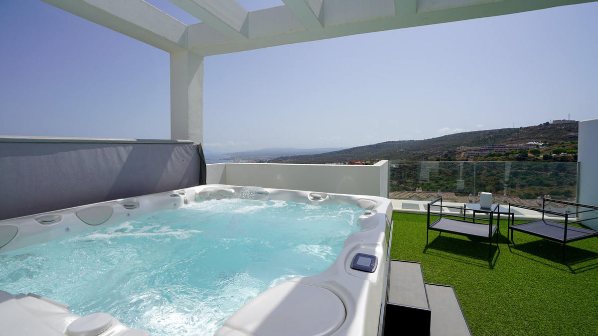 Upstairs, the master bedroom opens onto a private terrace where you can soak in the sea views, while two additional bedrooms with built-in wardrobes and two modern bathrooms (one en-suite) provide ample space for family or guests. The rooftop terrace is a true highlight—complete with a jacuzzi and chill-out space, ideal for relaxing or entertaining against the backdrop of endless ocean views.