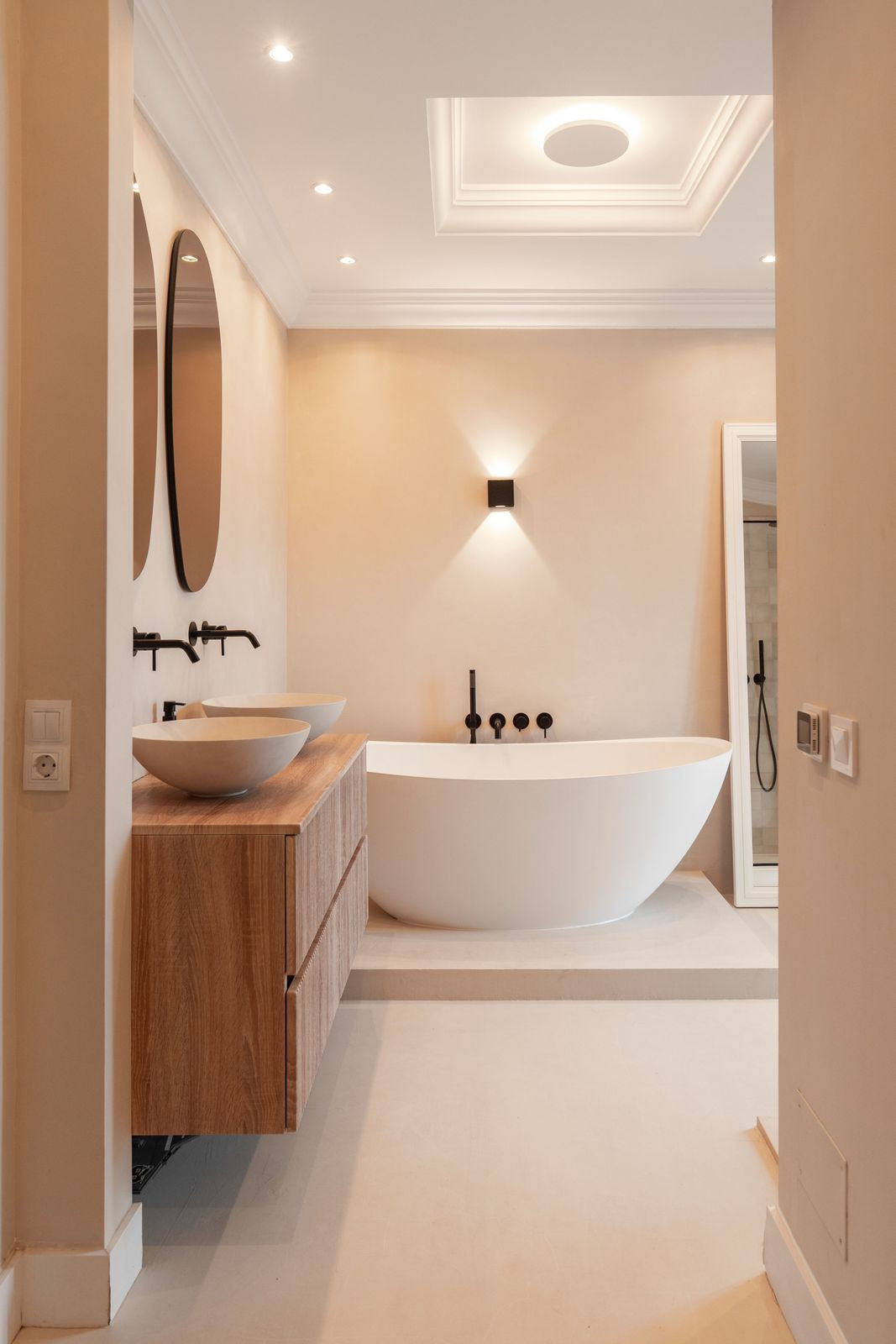 The upper level hosts a magnificent master suite complete with a private terrace, office, walk-in wardrobe, and a luxurious en-suite bathroom featuring double sinks, a freestanding bathtub, and a walk-in shower. An additional en-suite bedroom on this level also enjoys its own private terrace.