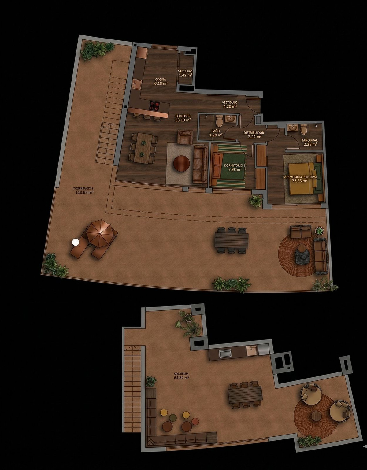 Located above the verdant courses of Calanova Golf Club, this exceptional penthouse is a design gem. With 87 m² of refined interiors and an extraordinary 194 m² wraparound terrace spanning two levels, the residence visually extends towards the sea. Its southwest orientation guarantees a backdrop of golden light and endless views from sunrise to sunset.