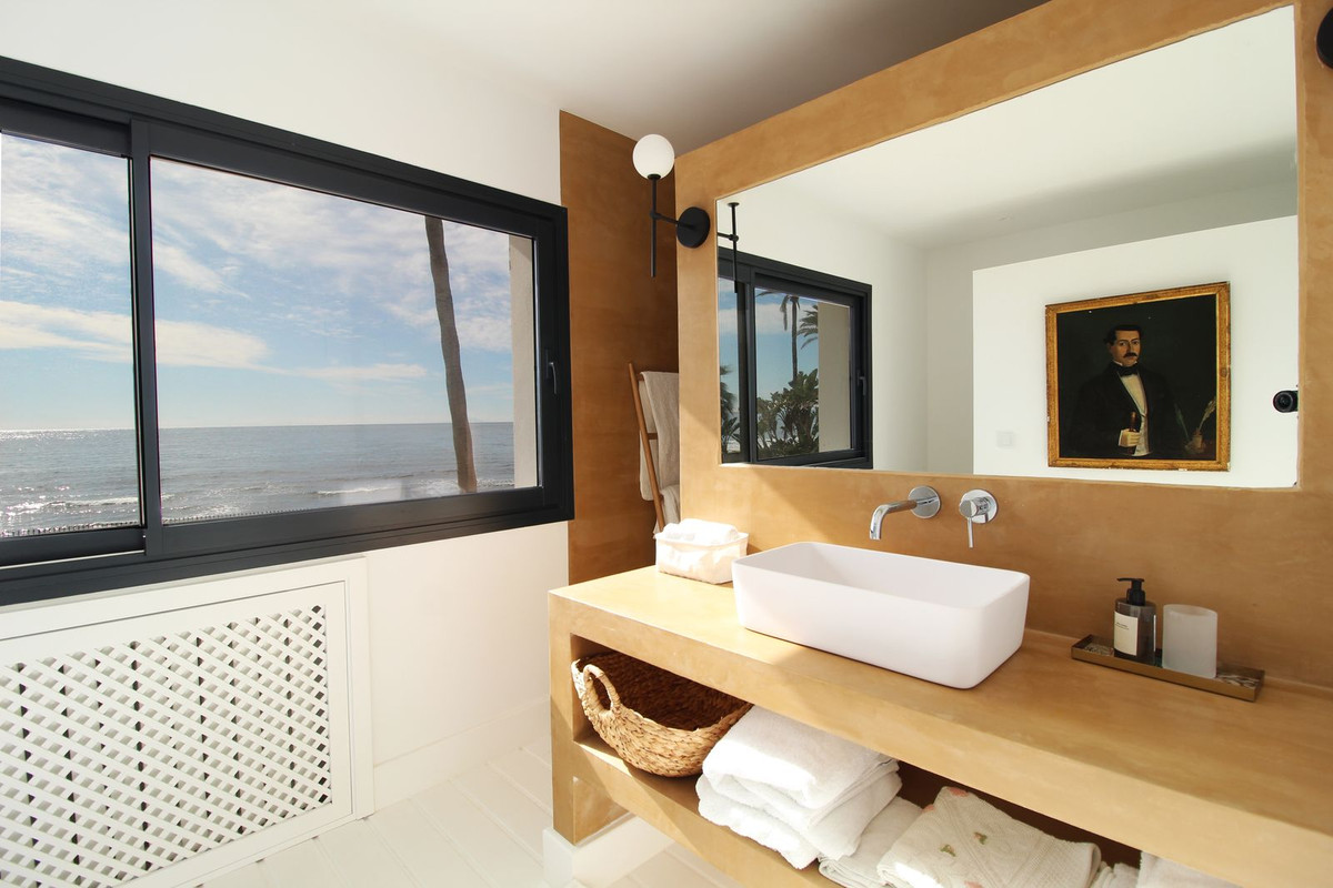 Exceptional villa situated front line beach in the highly desirable and gated community of Casasola, Guadalmina Baja. This recently renovated south-facing property enjoys breathtaking panoramic Mediterranean views with both Africa and Gibraltar in the distance. The property sits on a 2,300m2 plot and is both contemporary and Ibizan in style. The house has a sensible distribution, constructed around two central courtyards that allow light to flow throughout the property. The living room is divided into two separate areas with a cosy sitting room with a fireplace off the main section. This then leads to the dining area that has comfortable seating for at least 10 guests. Both the living and dining areas access the huge covered terrace which in turn leads out to the expansive gardens and pool area. The stunning "L" shaped kitchen has been well thought through and includes Siemens appliances. There is also a separate laundry room off the kitchen. The ground level of the property has six bedrooms suites, two of which have direct access to the gardens and pool area. Furthermore, there are two staff bedrooms at the rear of the property. The upper level consists of the master suite, twin bathrooms, a host of wardrobe space, plus a solarium from which you can enjoy the views and the sound of the waves crashing on the shore. The community has 24h security guards and is located just a short drive from San Pedro and Puerto Banus.