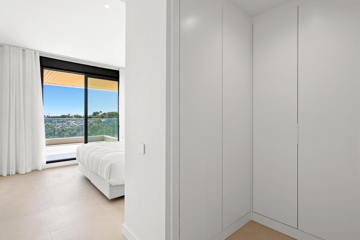The interior layout features a bright living room, a dedicated dining area, and a guest room, all complemented by high-quality finishes such as double glazing and underfloor heating in the bathrooms. The kitchen is supported by a utility and laundry room, while fitted wardrobes and a storage room provide ample space for organisation. Comfort is ensured with individual air conditioning units, aerothermics, and fibre optic internet, while security is prioritised with a 24-hour alarm and security service.