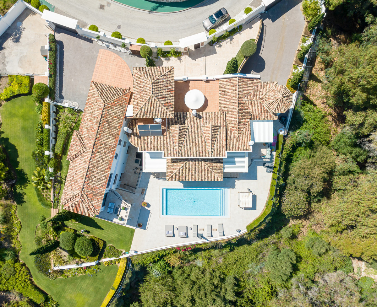 community of El Herrojo Alto, and due to its elevated secluded position it offers breath-taking views over its own private estate of more than 10,000m2 and towards the panoramic view of the Mediterranean sea and Marbella’s striking La Concha mountain.