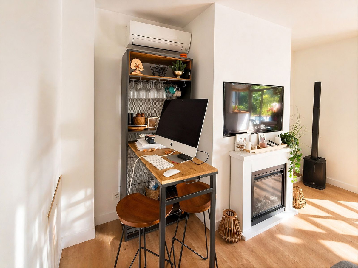 La maison principale, récemment rénovée, offre 88 m² habitables, judicieusement répartis en deux chambres spacieuses, une salle de bain complète et un espace de vie convivial avec cheminée, créant une atmosphère chaleureuse et élégante en toute saison. De grandes fenêtres laissent entrer une abondante lumière naturelle et favorisent une transition harmonieuse avec la verdure environnante.
