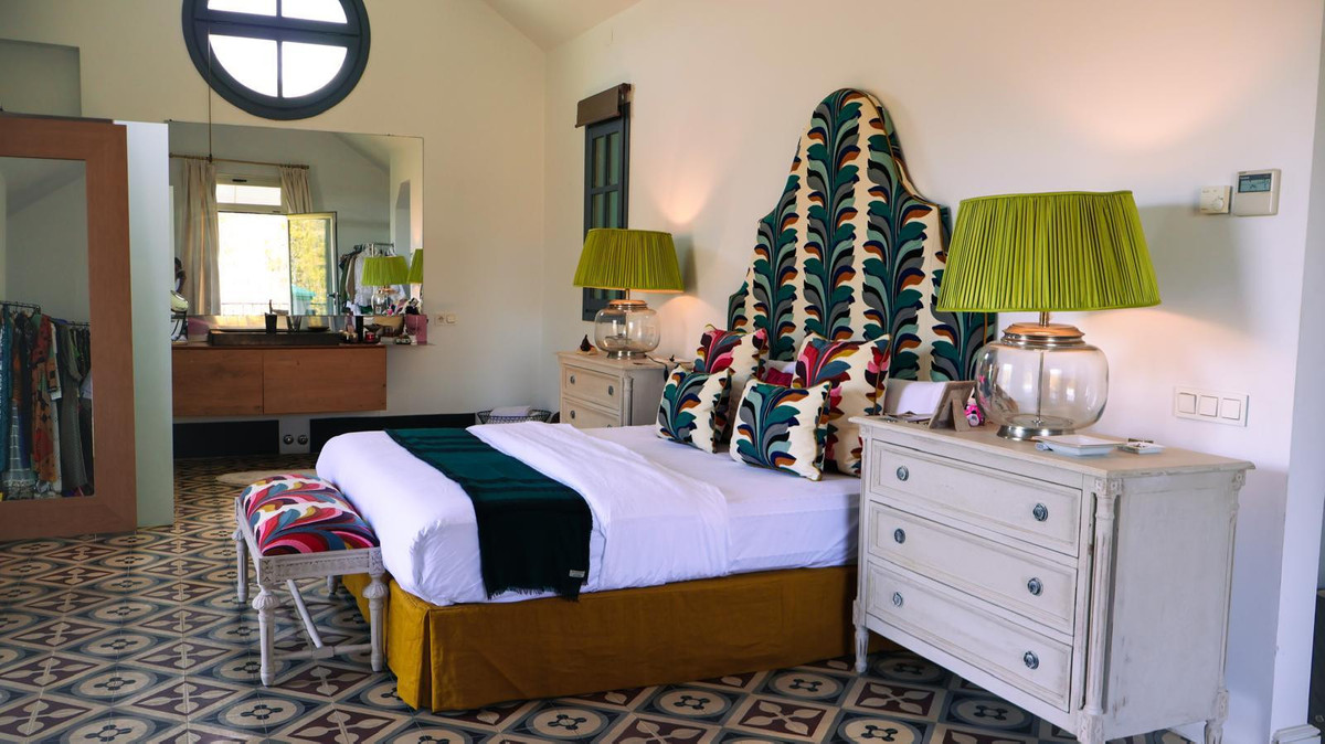 Villa de caractère orientée sud-ouest, idéalement située avec piscine chauffée, fontaine en marbre ornée de colonnes au centre du jardin et sols hydrauliques, à environ 3 km de la plage et 6 km de Puerto Banus.
