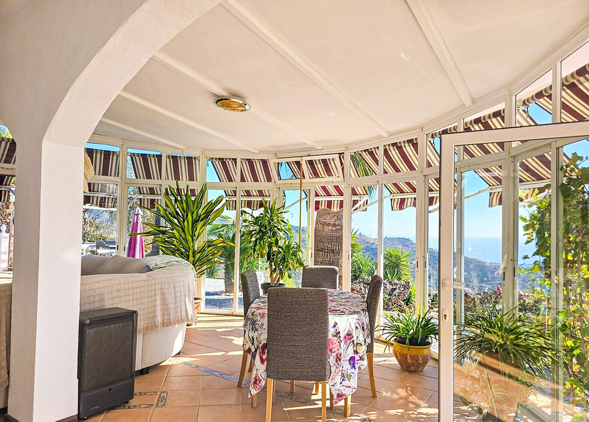 La vaste véranda constitue le véritable cœur de la propriété. De là, vous pourrez profiter toute l'année d'une vue panoramique sur les montagnes environnantes et la mer Méditerranée.