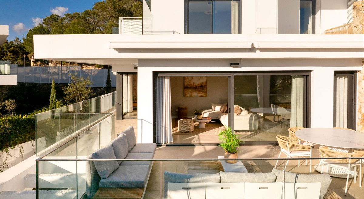 L'appartement, réparti sur deux niveaux, offre une sensation d'espace et de luminosité immédiate. La pièce de vie principale s'ouvre naturellement sur une vaste terrasse grâce à de grandes baies vitrées coulissantes, ce qui agrandit visuellement l'espace et renforce le lien avec l'extérieur. C'est le type d'agencement qui convient aussi bien à la vie quotidienne qu'à la réception de invités.