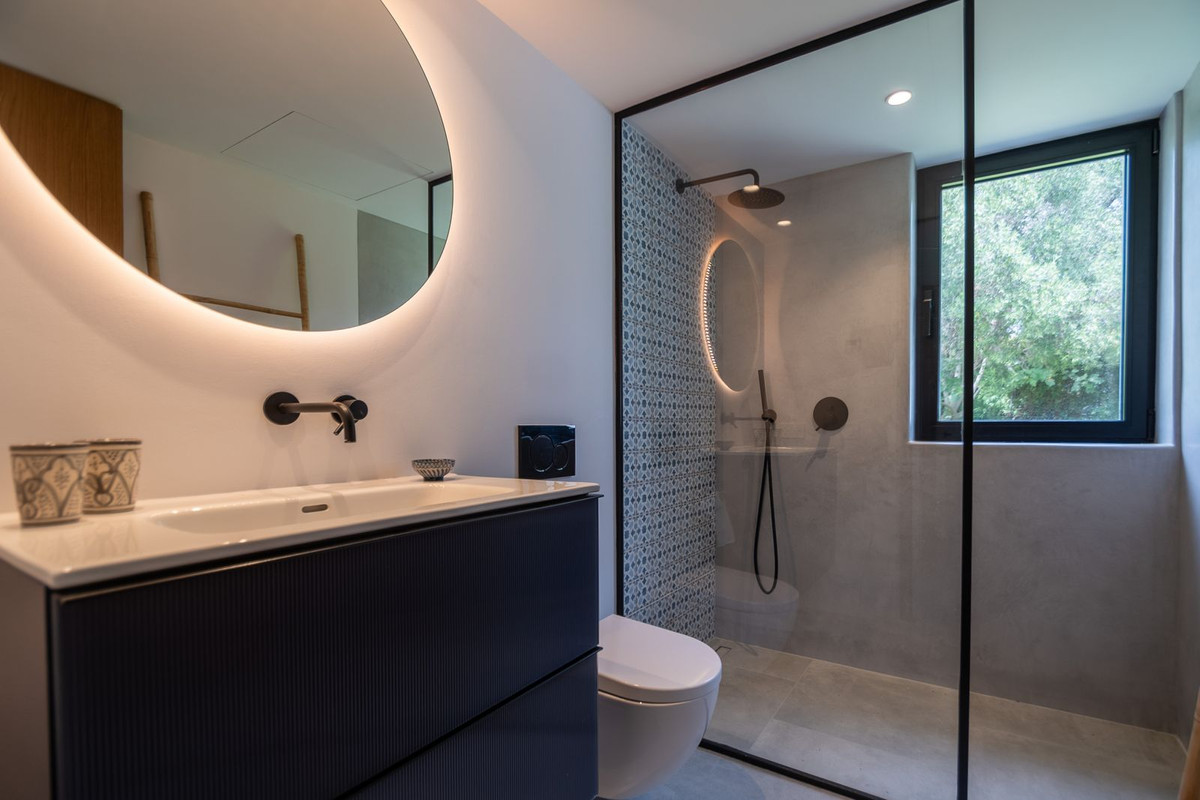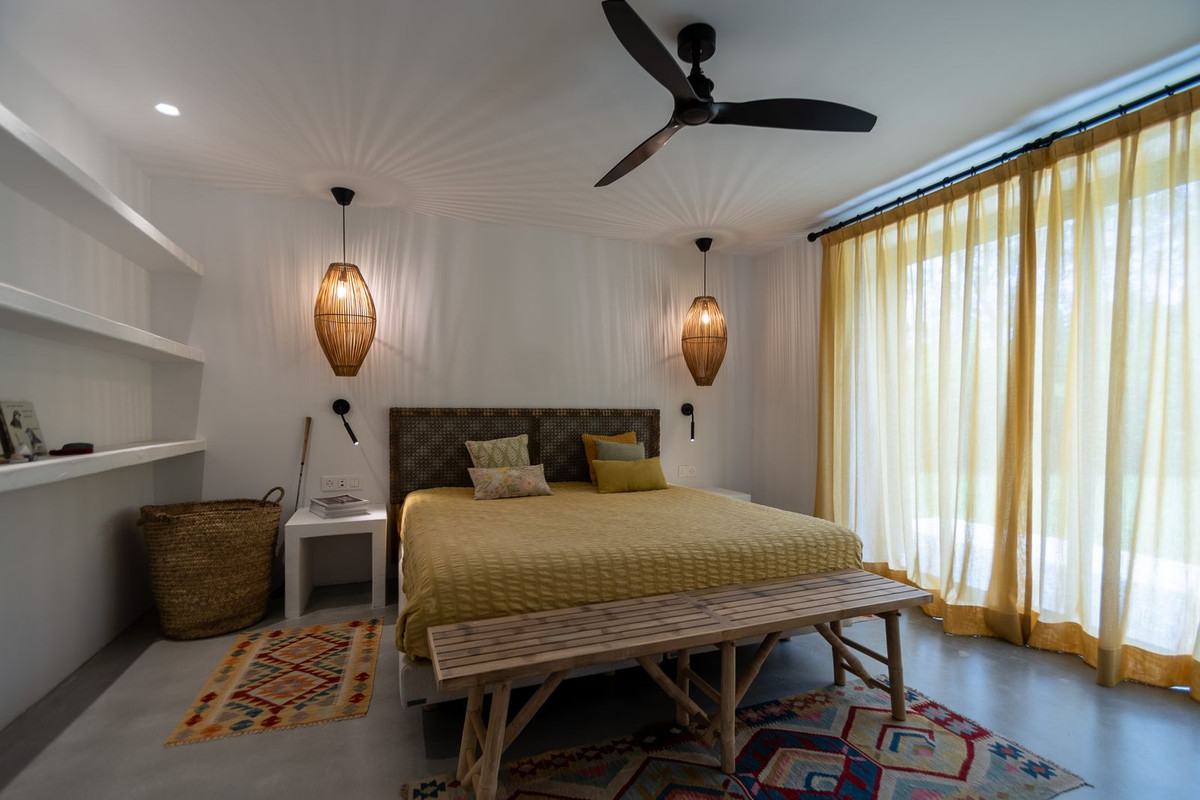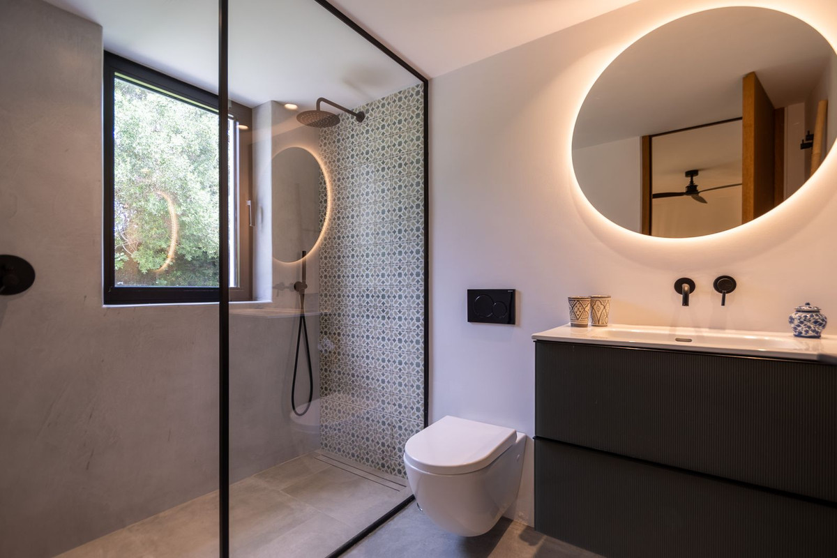 La maison principale comprend 3 chambres avec salle de bains privative, des espaces de vie lumineux, des plafonds à poutres apparentes et des finitions de haute qualité, alliant style andalou et rénovation moderne.