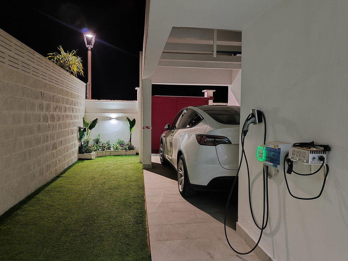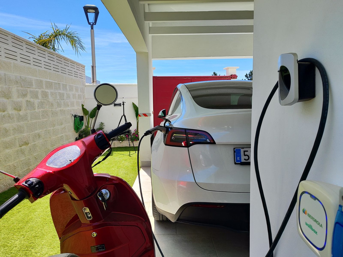 The property is prepared for current and future needs, including an electric vehicle charging point and an additional charging point for an electric motorcycle.
