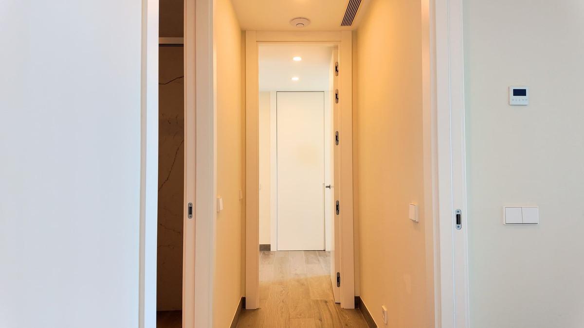 The open-plan layout connects kitchen, dining and living areas. The kitchen is fully fitted with high end appliances and modern fittings. The Master-bedroom has an ensuite bathroom and excess to the terrace where you can enjoy your morning coffee. There is a guest bedroom with a separate bathroom. The apartments sits in a secure gated community and has a private underground parking space and a storage room.
