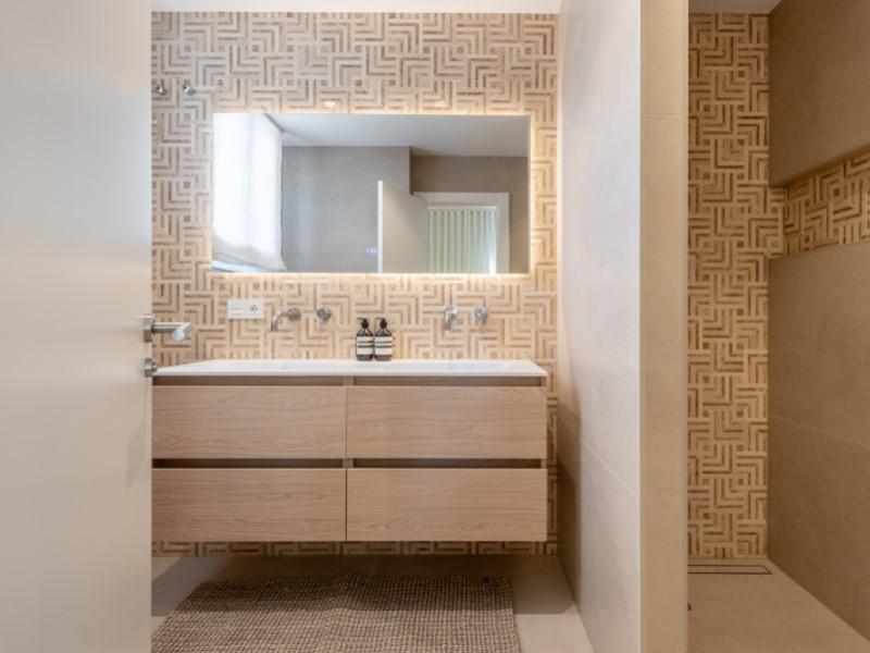 Three generous bedrooms and three full bathrooms on the upper floors offer privacy for family and guests alike. Premium finishes throughout, custom-built wardrobes, and the signature Mallorquina shutters that filter the midday sun and close the world out at night.